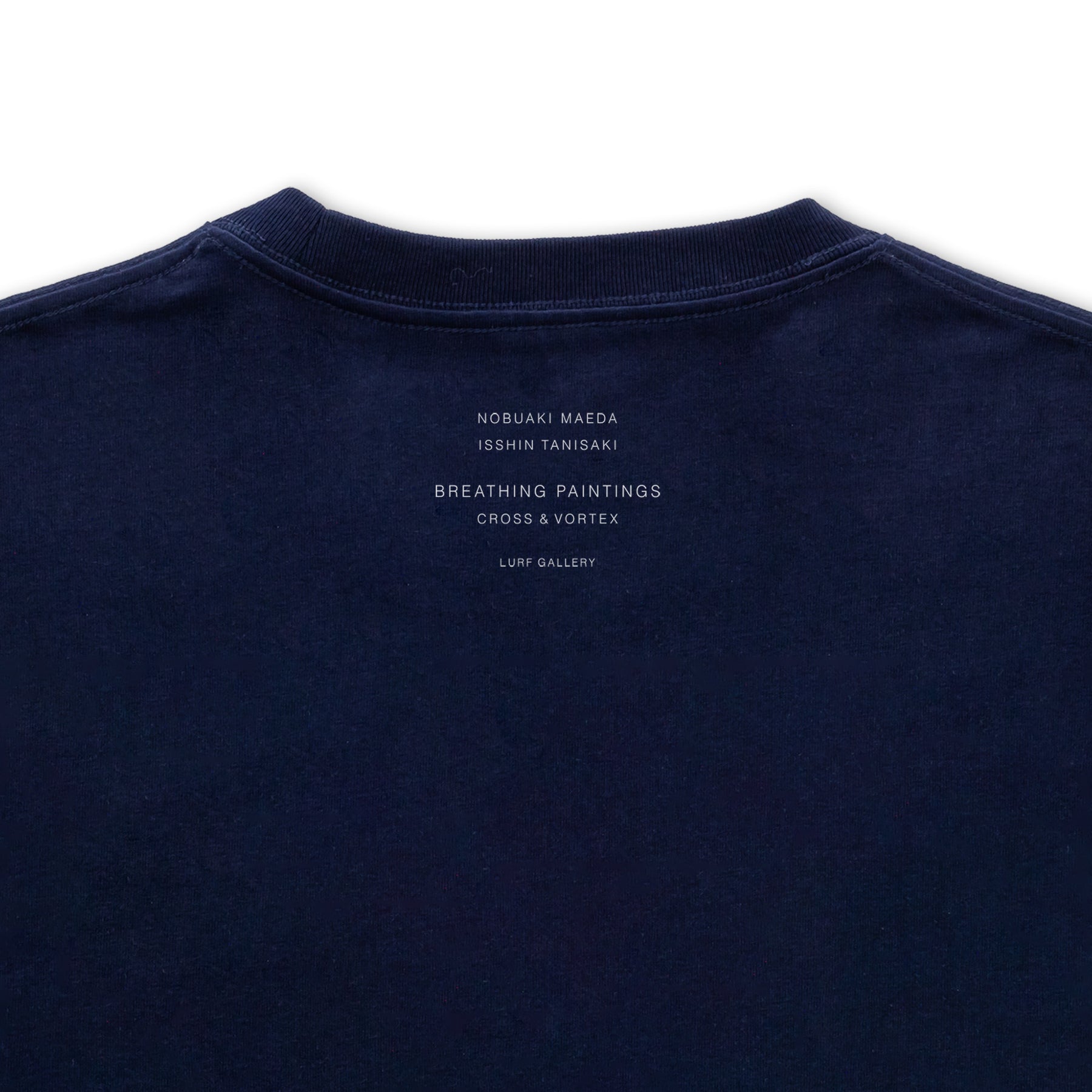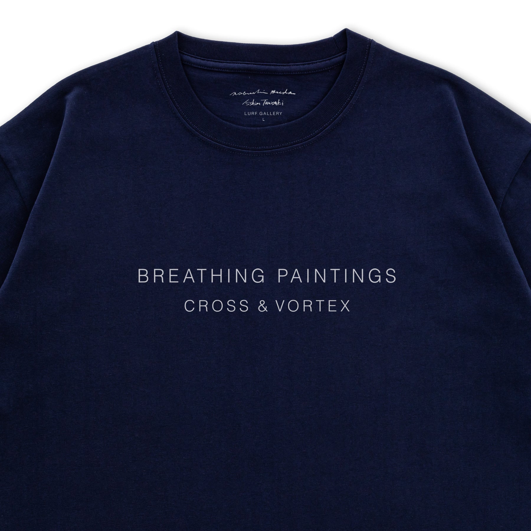 前田信明と谷﨑一心 の二人展「呼吸する絵画 ― 交差と渦」に併せて製作したTシャツ。本展示タイトルをプリントした、ルーフギャラリー限定アイテムです。