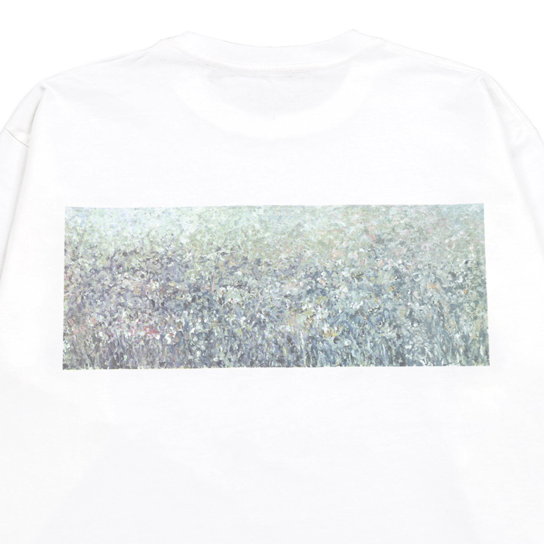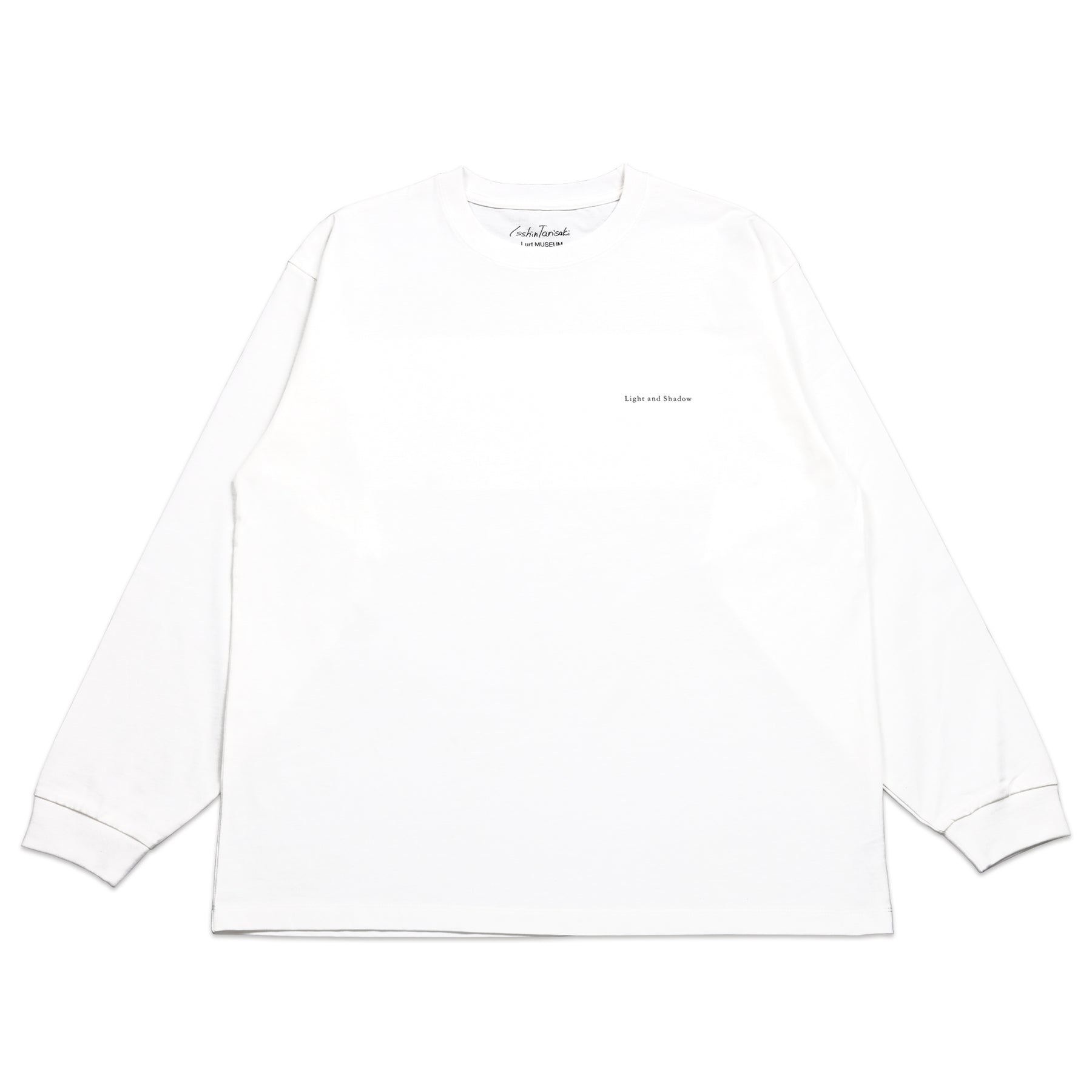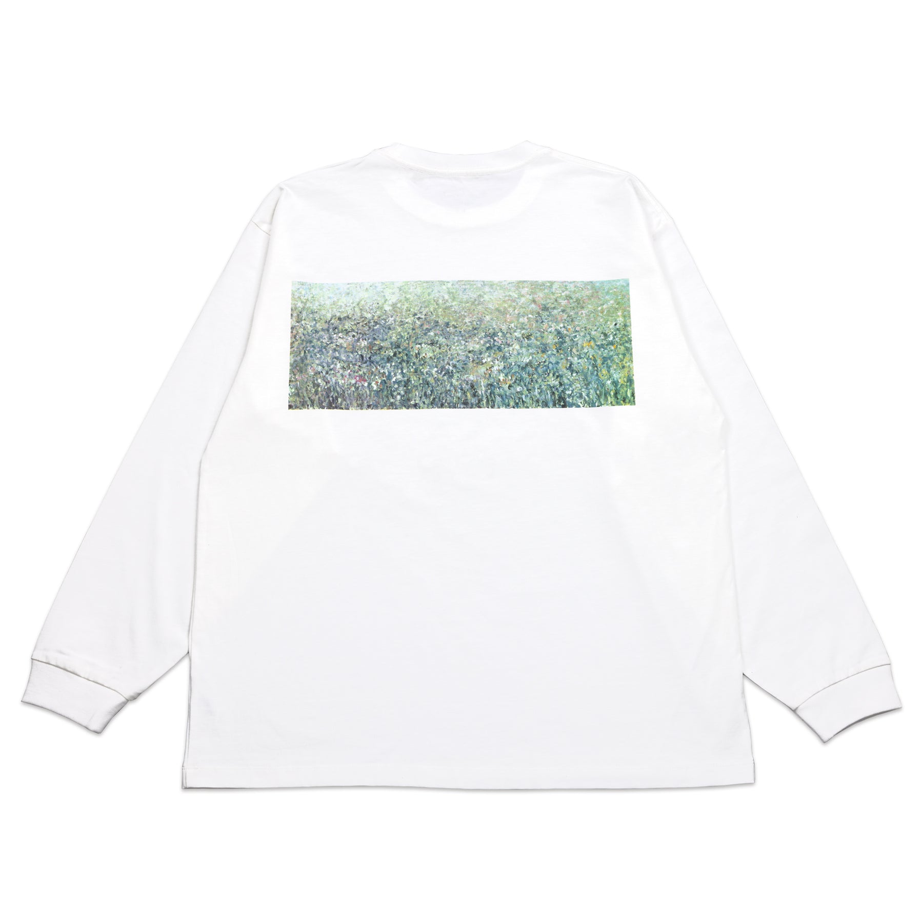 谷﨑一心 新作展「光陰」に併せて製作した長袖Tシャツ。フロント左胸にはシンプルなロゴプリント、バックプリントには本展覧会のなかで最大サイズとなる作品「花と森」(6000 × 2400mm)を色鮮やかに表現。
