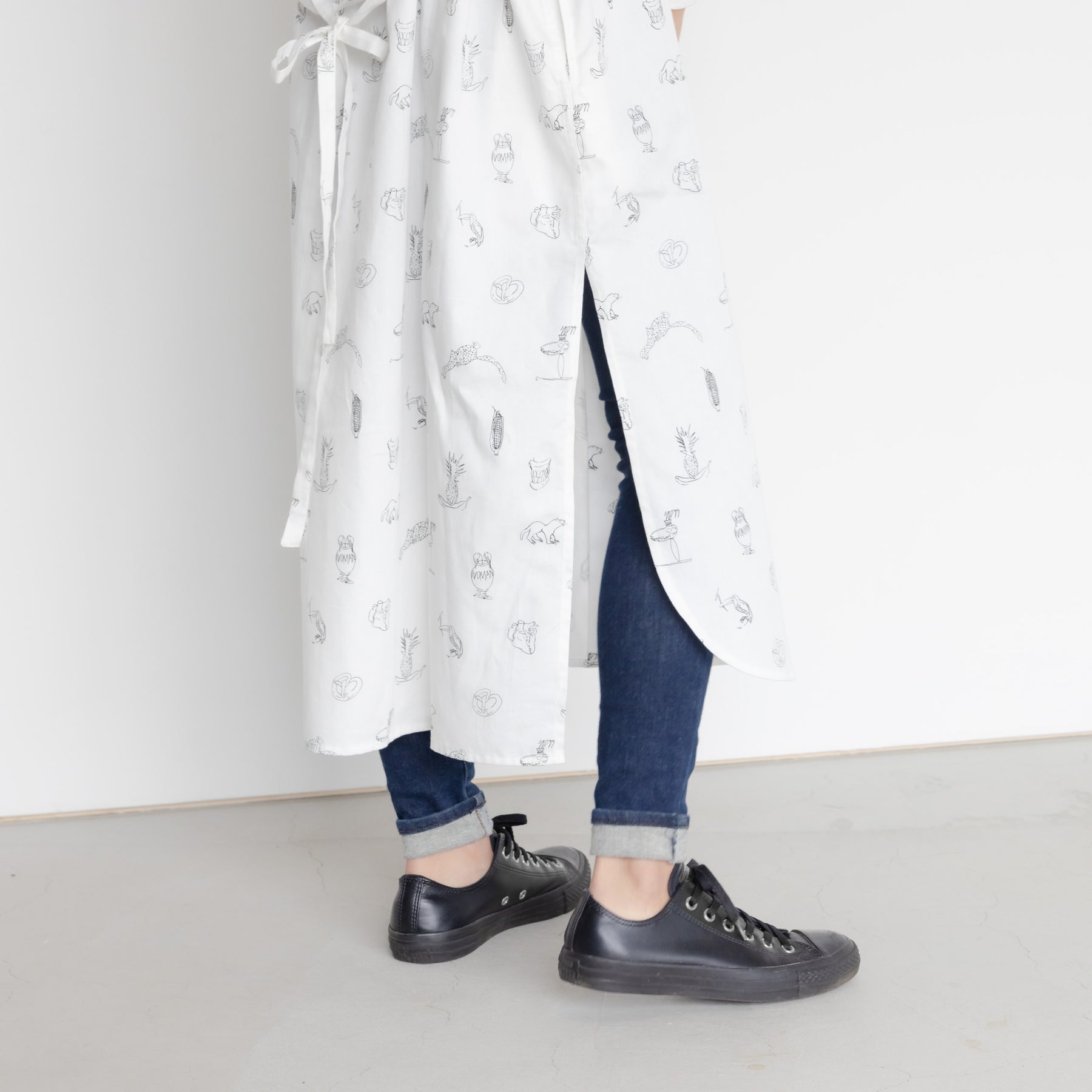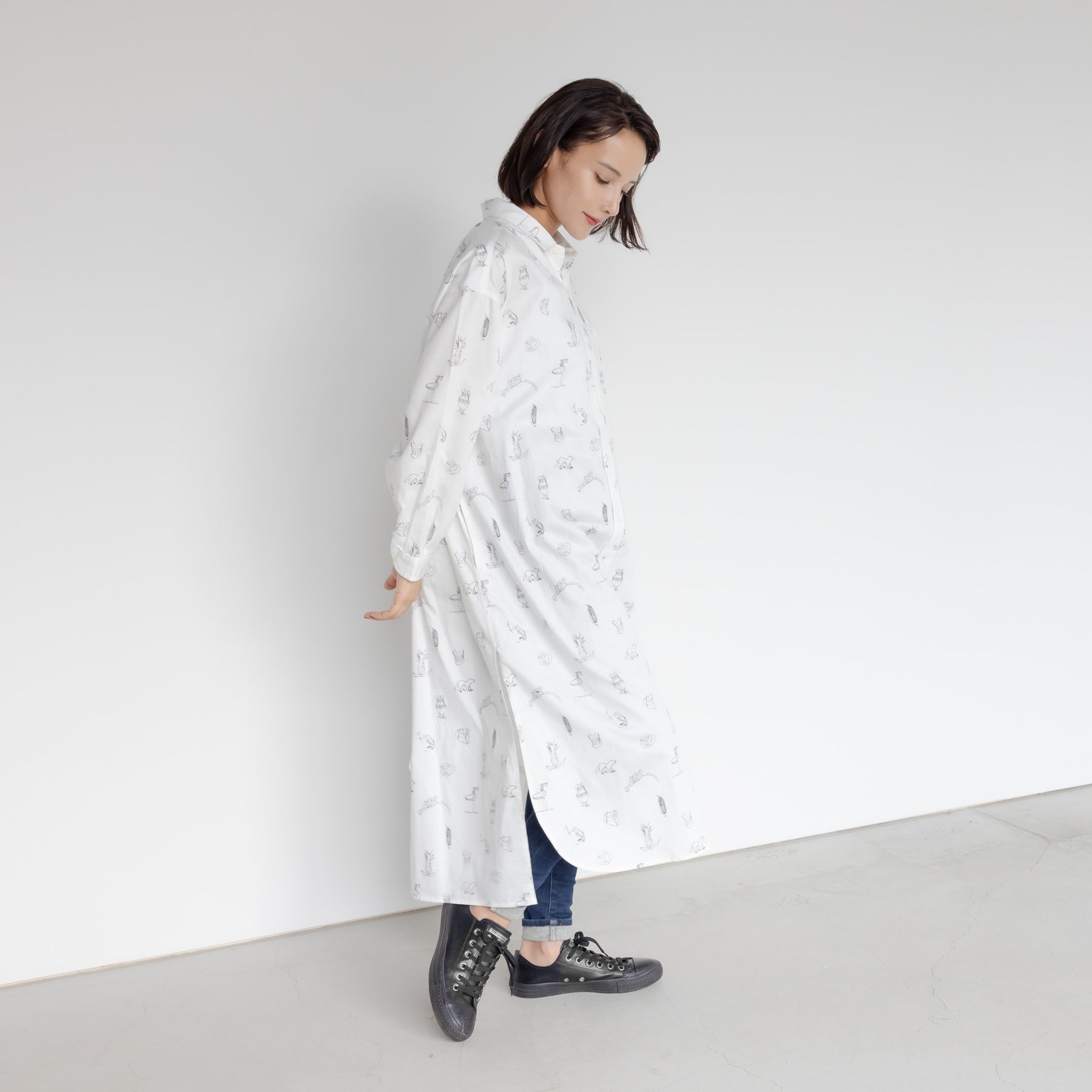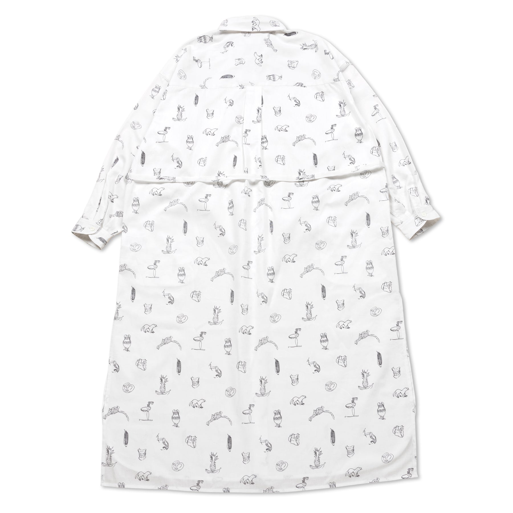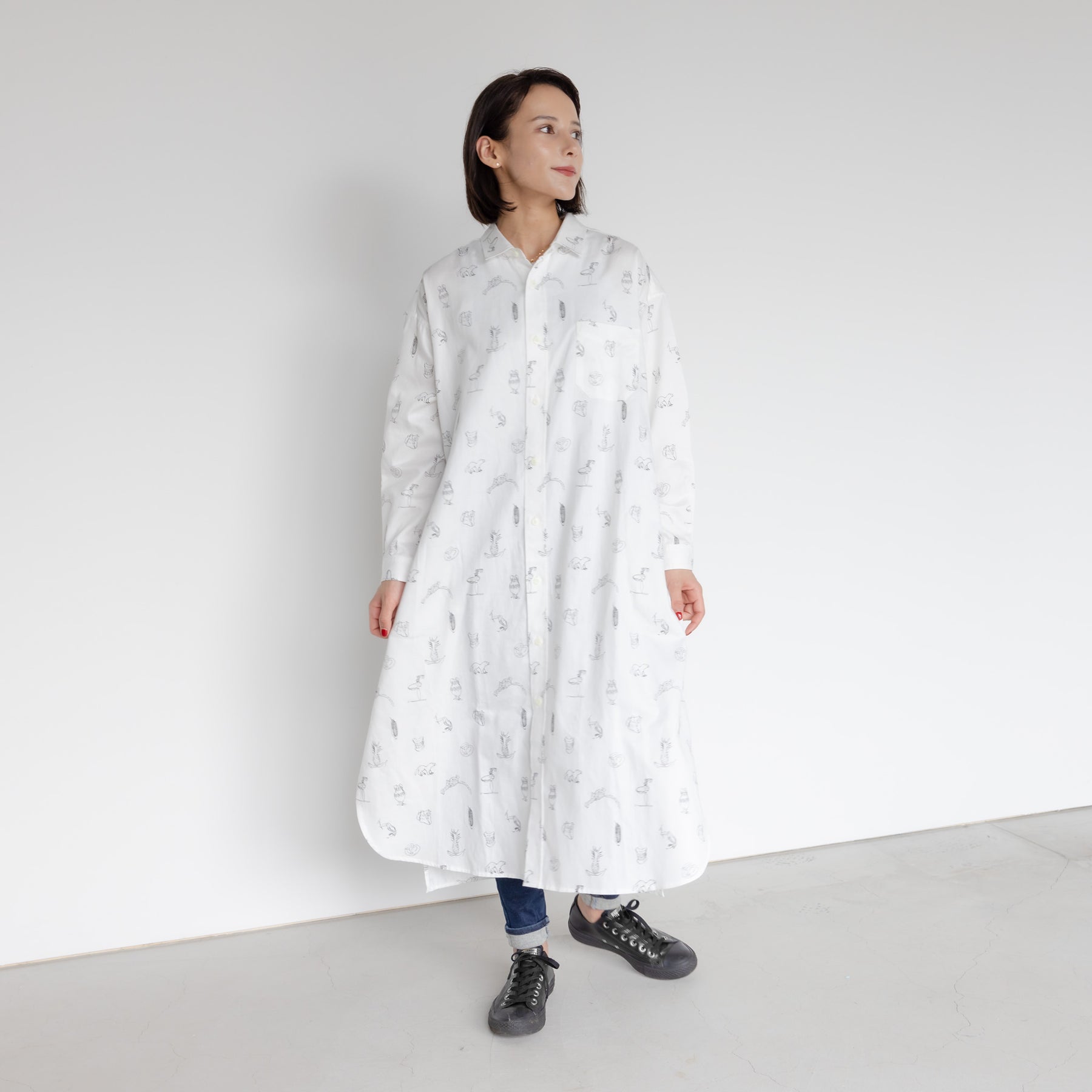 川内理香子 個展「human closely」に併せて製作したシャツワンピース。川内理香子さんの複数の作品からモチーフを抜き出してプリントしました。
