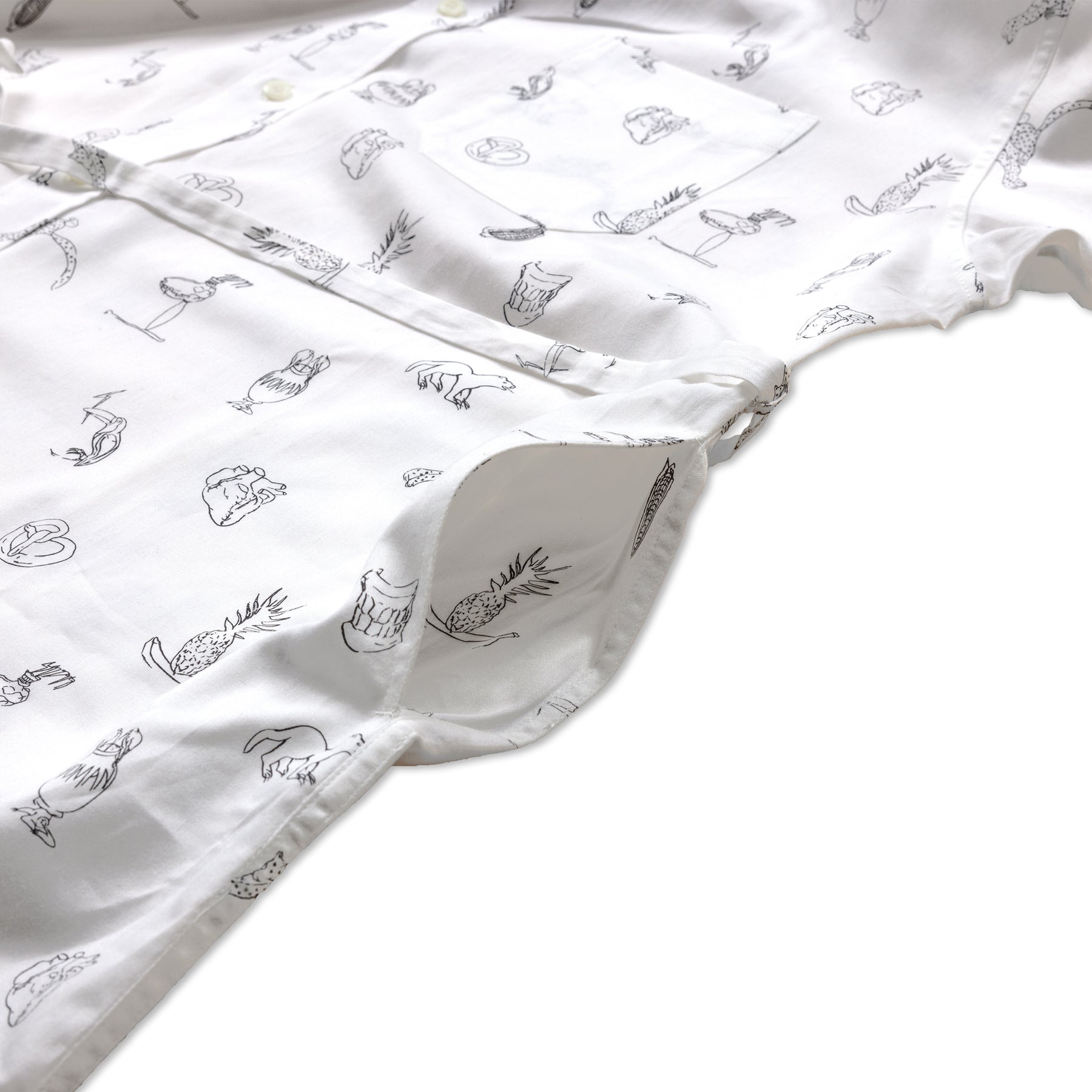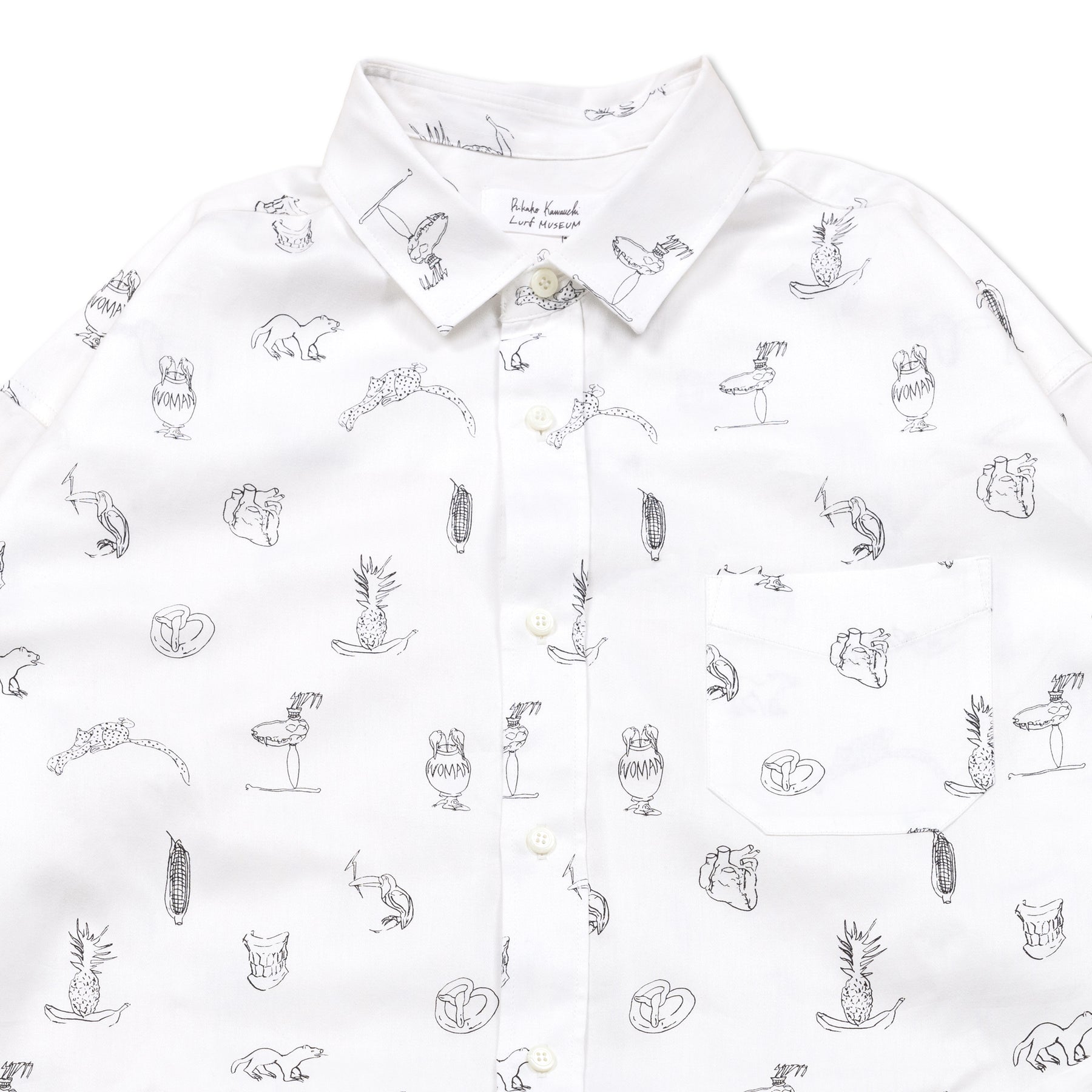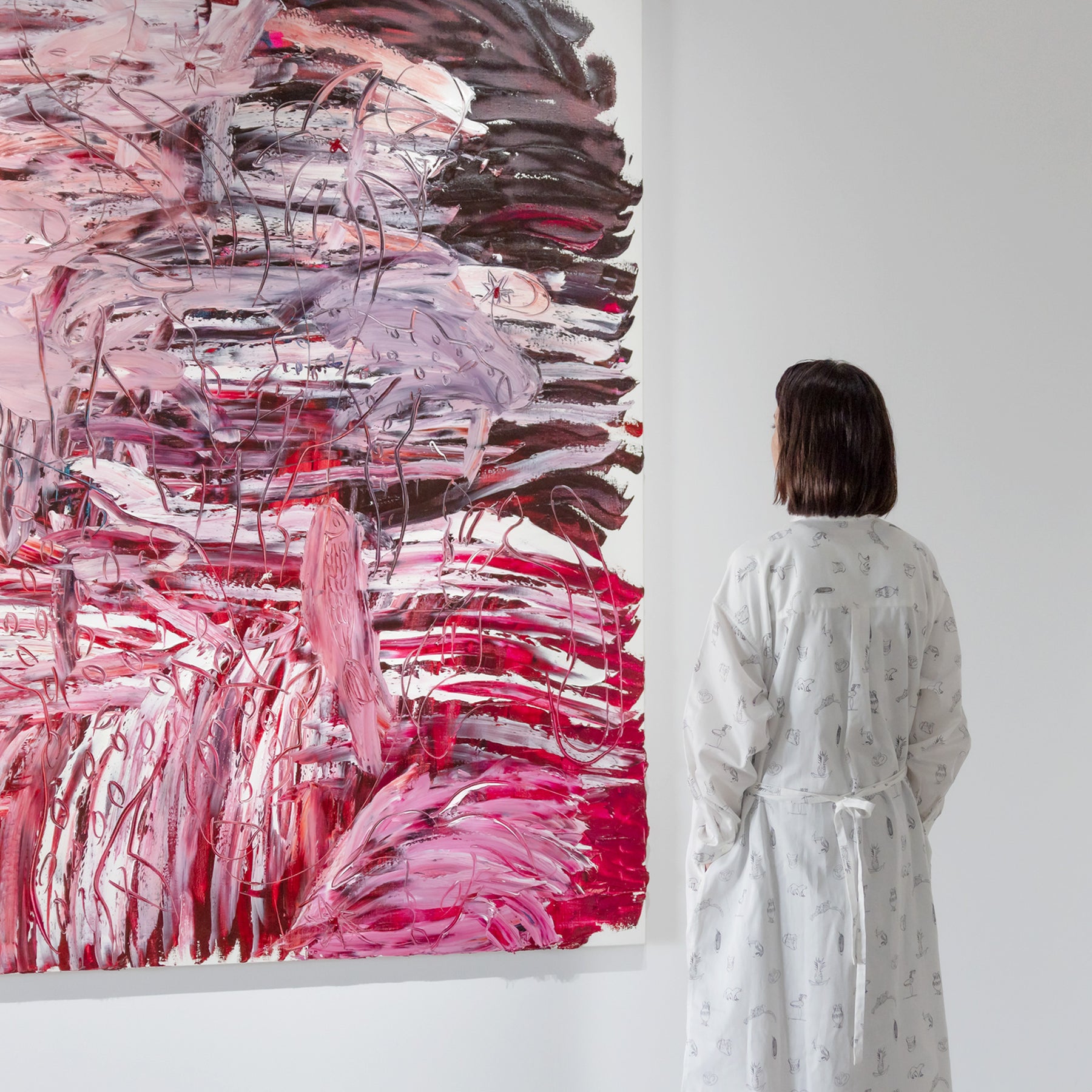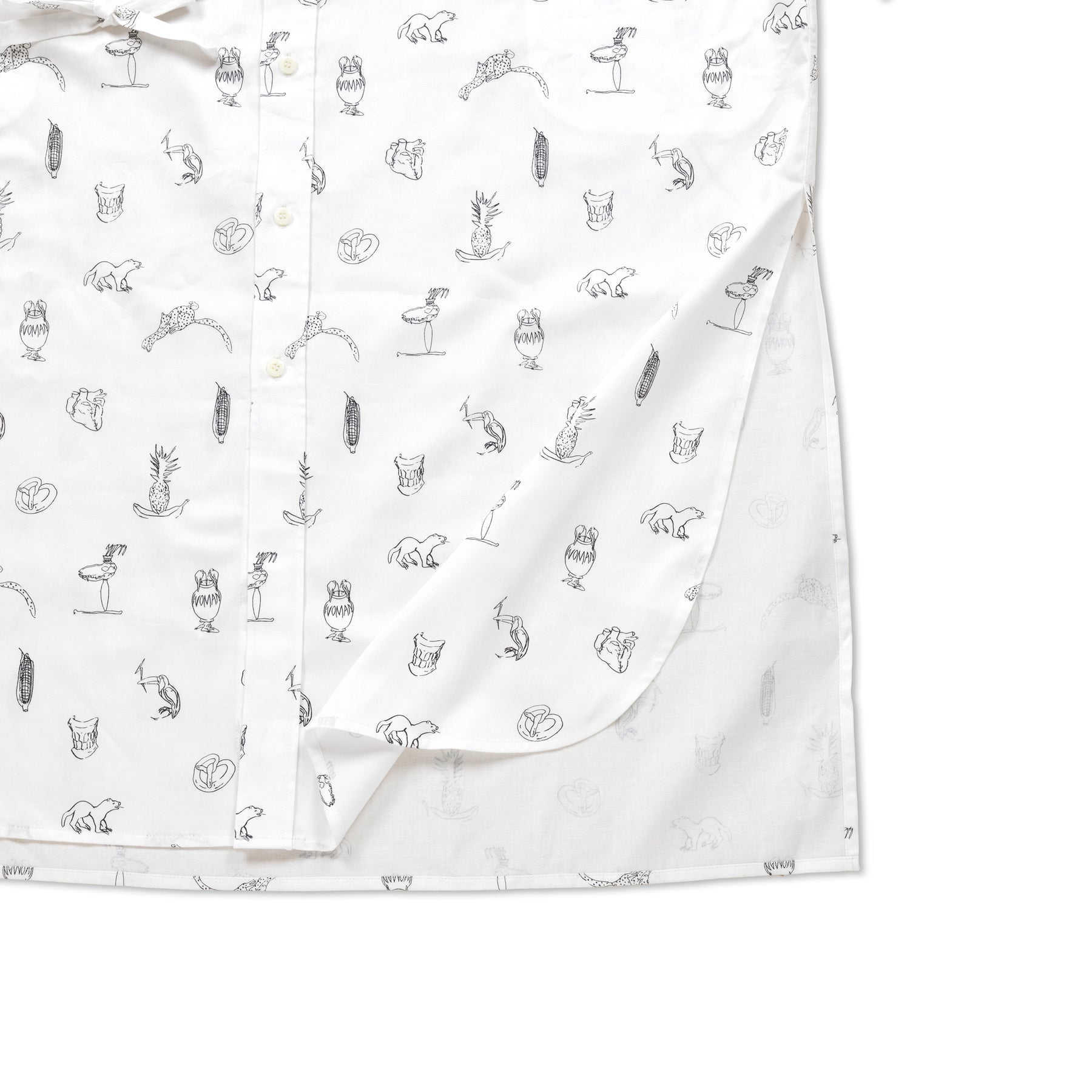 川内理香子 個展「human closely」に併せて製作したシャツワンピース。川内理香子さんの複数の作品からモチーフを抜き出してプリントしました。