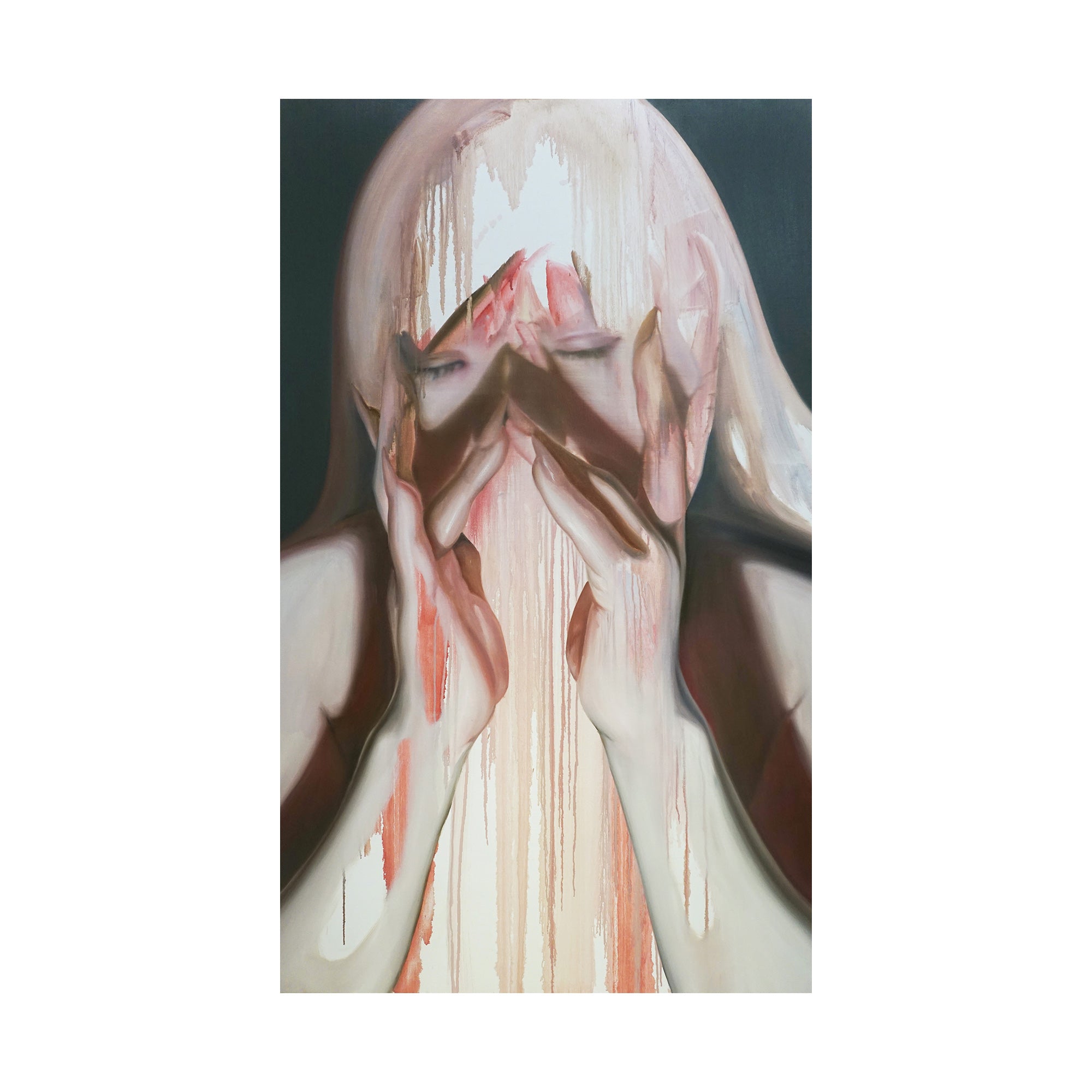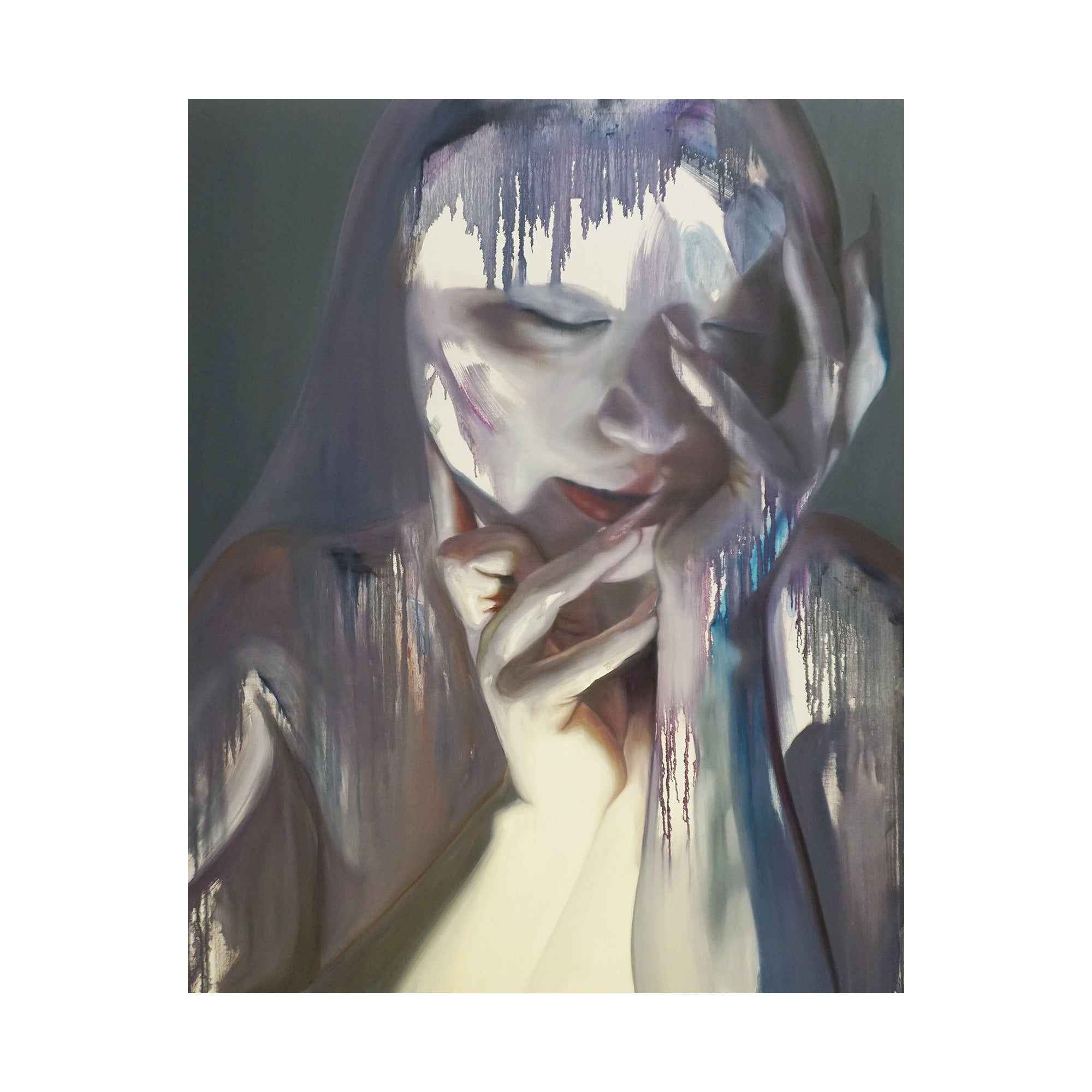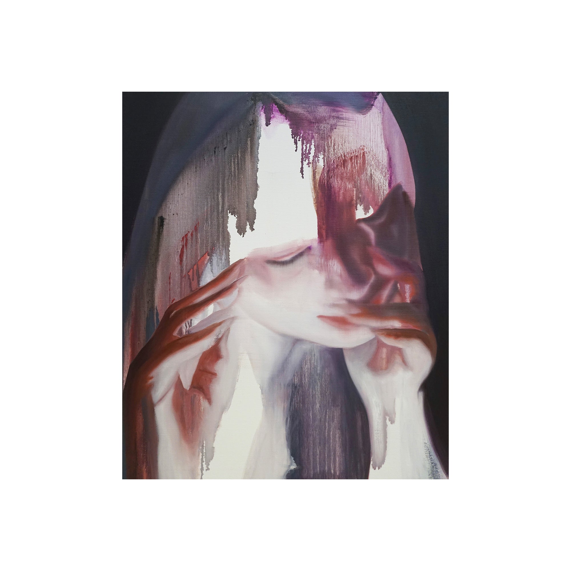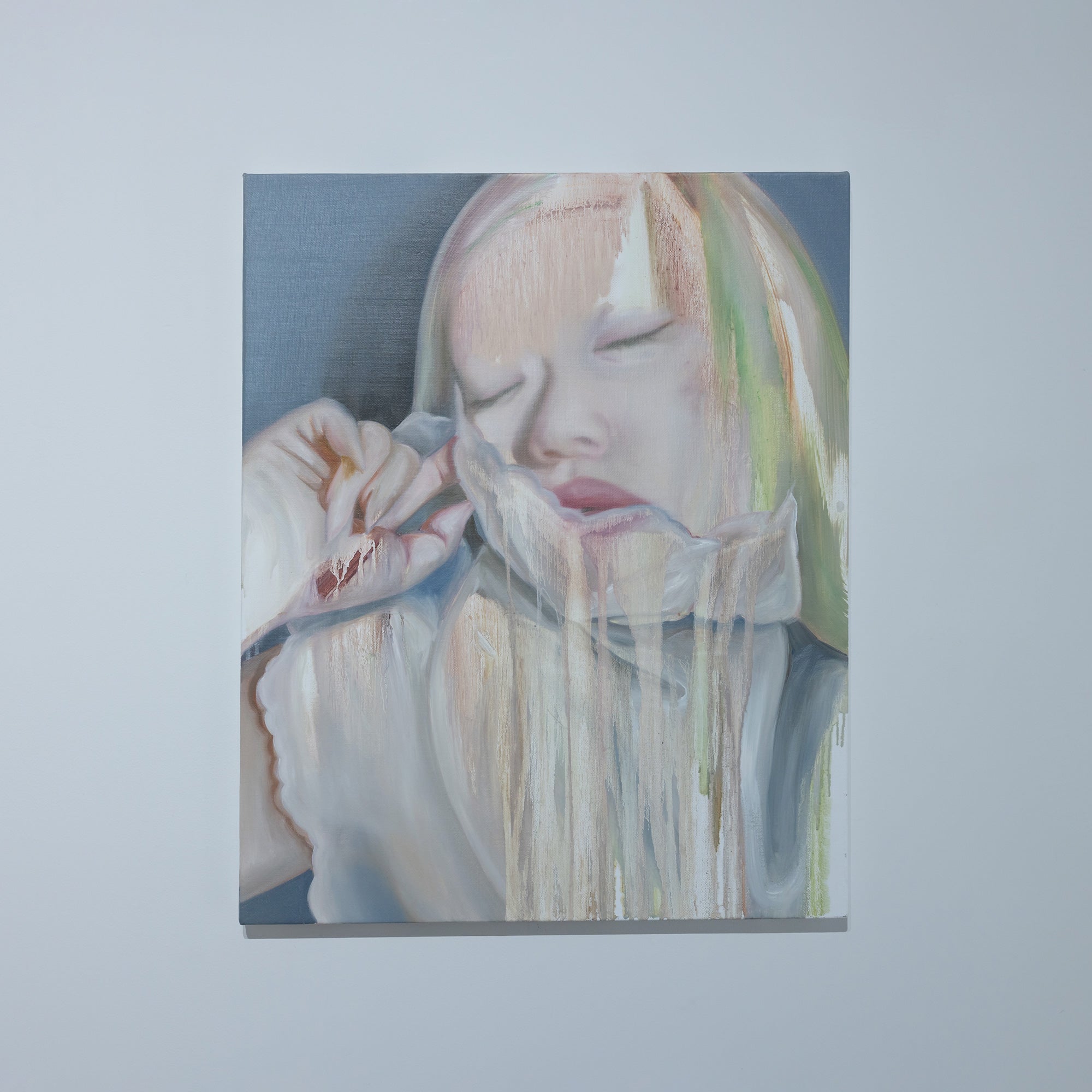 これまで人間の物質としての輪郭と現象としての状態の双方に注目し、そのあわいに蠢く不定形で非人間的な存在を描く。初期より一貫して人物をモチーフとし、そのスタイルは具象的な描画からランダムなストロークを用いた抽象的な描画へと変化している。白飛びのような情報を欠いた空白、身体の隙間にだらりと流れる液体、セルフィーやアーティスト写真を思わせるエゴイスティックな表情やポーズ。それらが画面全体へ溶け込むように描かれることで、「私」から「何か」への変異のプロセスそのものを捉え、これまでの人間像から脱しつつある未完の存在としてのわれわれの姿をあらわにしている。
