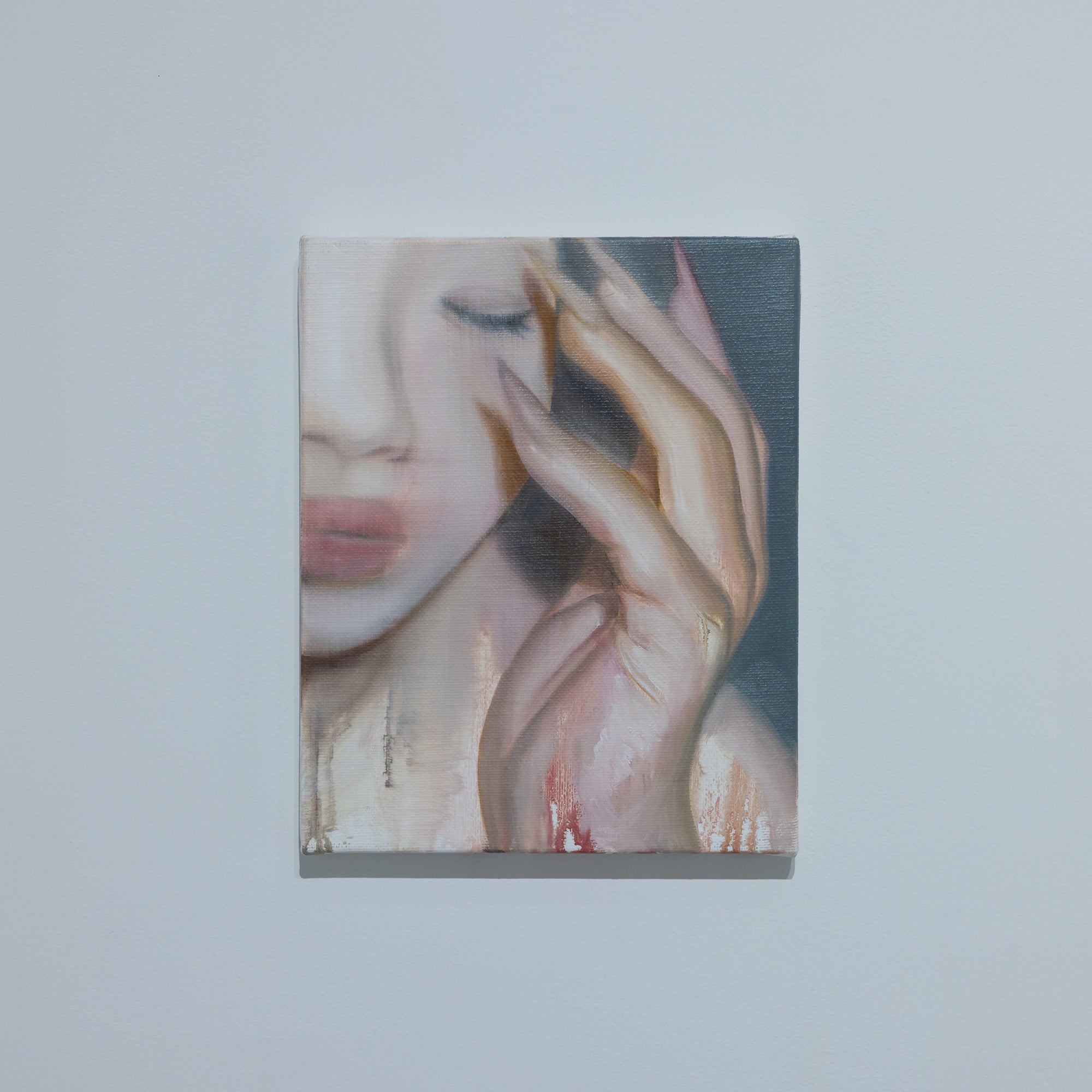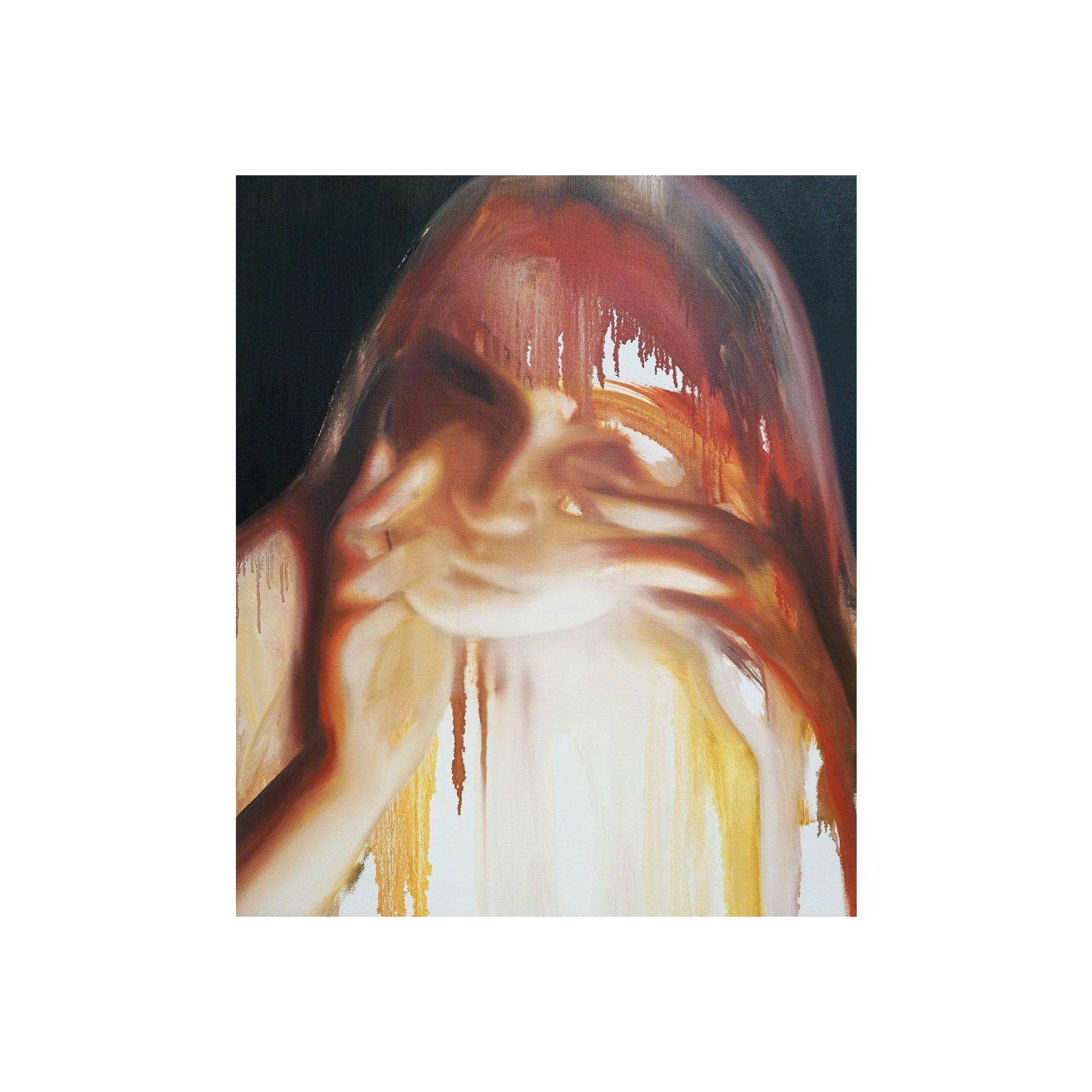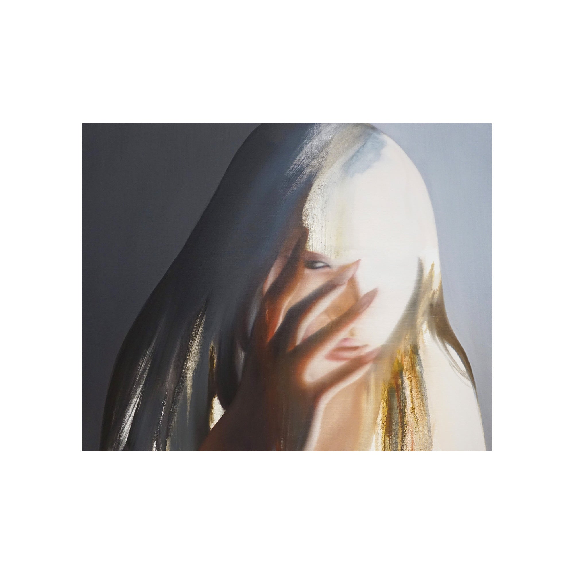 これまで人間の物質としての輪郭と現象としての状態の双方に注目し、そのあわいに蠢く不定形で非人間的な存在を描く。初期より一貫して人物をモチーフとし、そのスタイルは具象的な描画からランダムなストロークを用いた抽象的な描画へと変化している。白飛びのような情報を欠いた空白、身体の隙間にだらりと流れる液体、セルフィーやアーティスト写真を思わせるエゴイスティックな表情やポーズ。それらが画面全体へ溶け込むように描かれることで、「私」から「何か」への変異のプロセスそのものを捉え、これまでの人間像から脱しつつある未完の存在としてのわれわれの姿をあらわにしている。