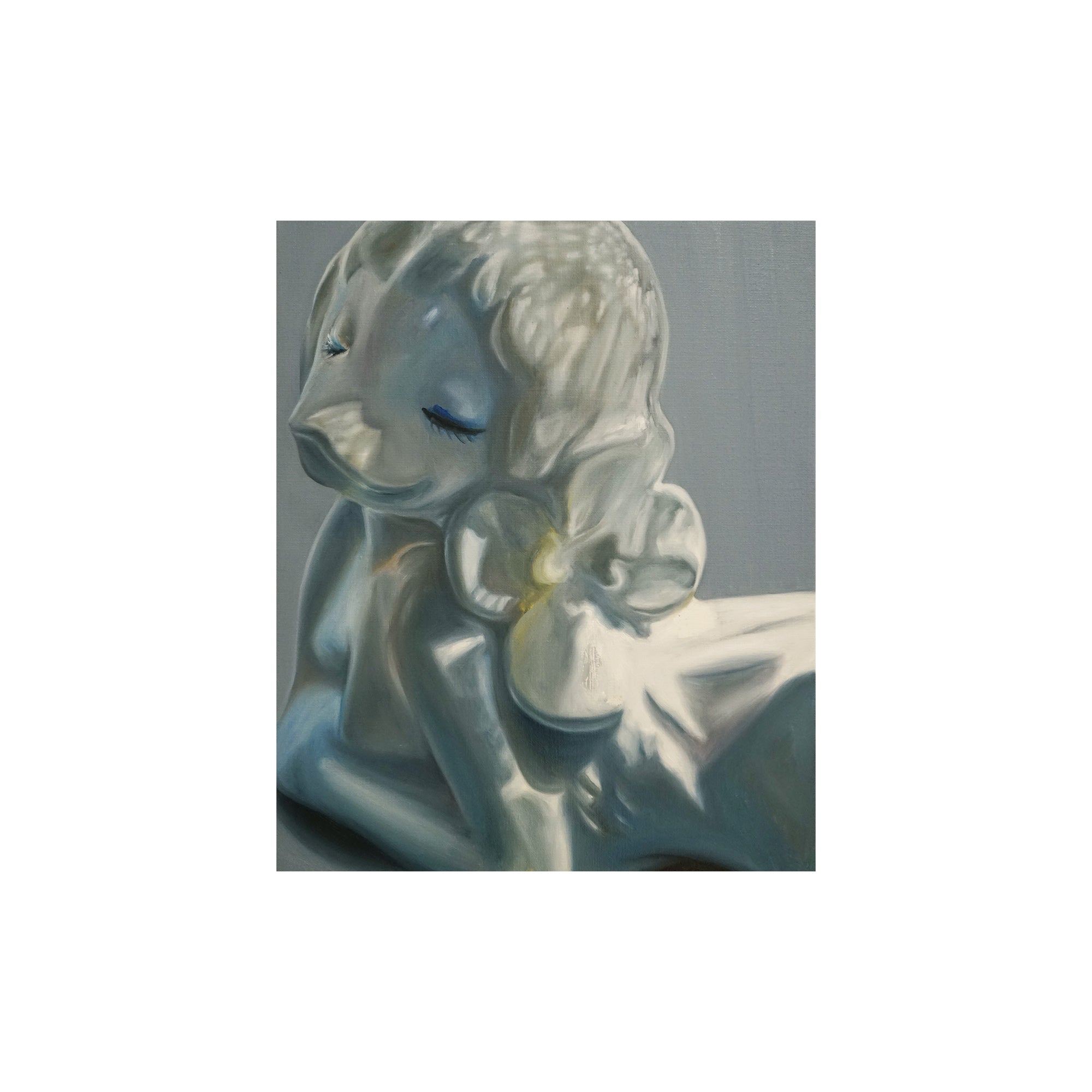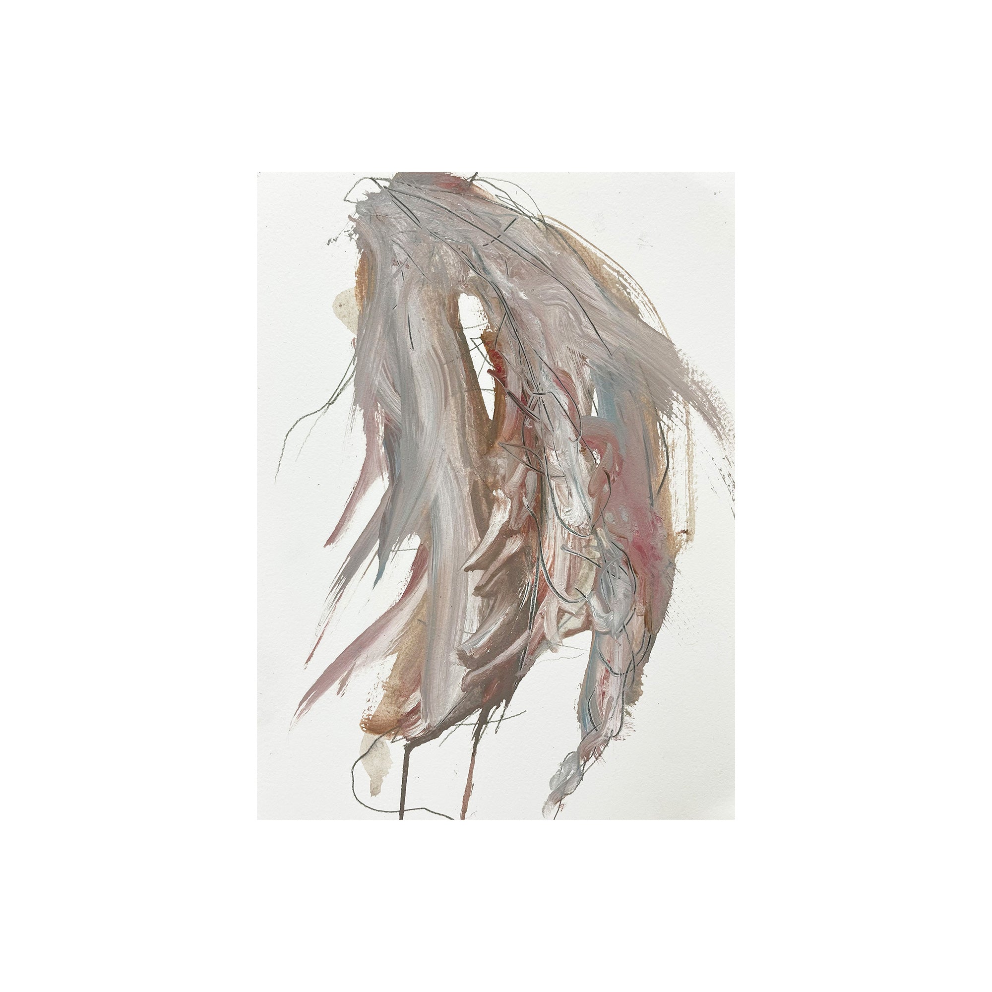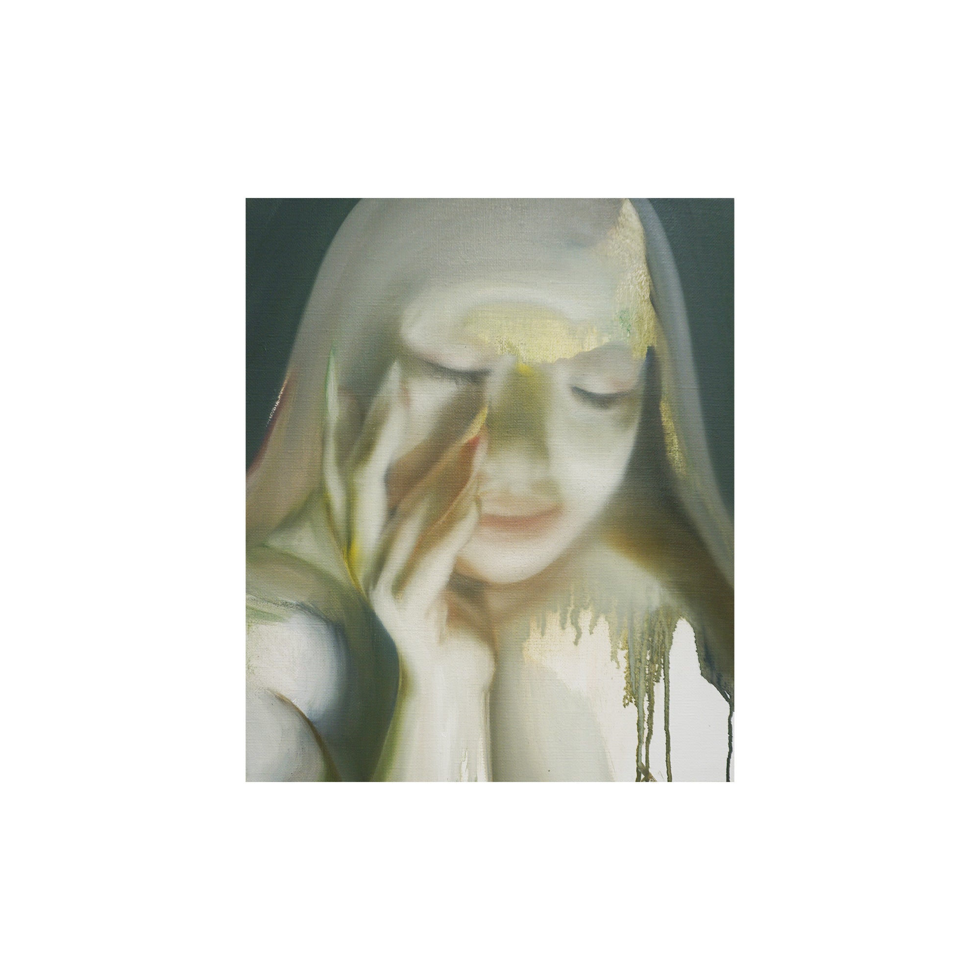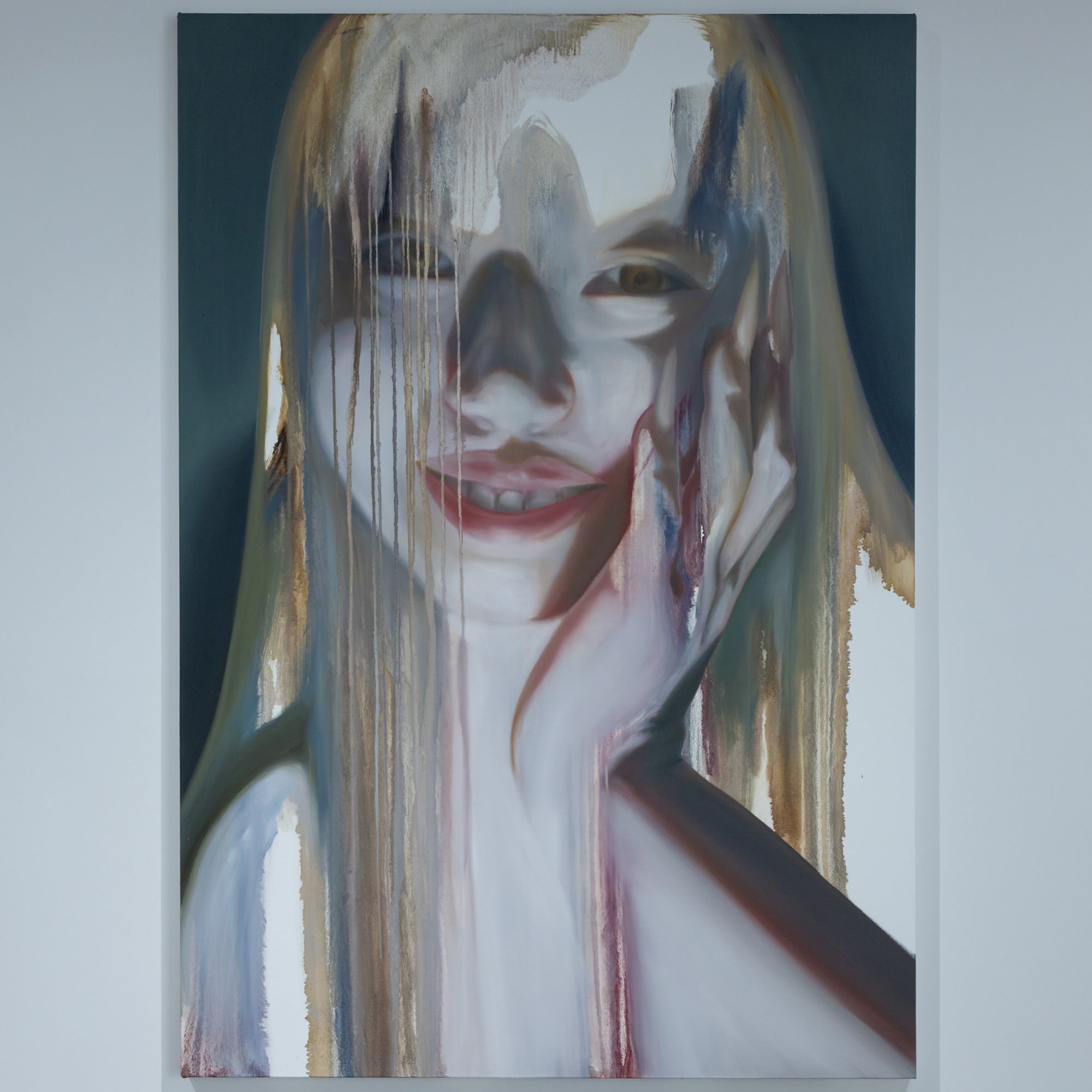 これまで人間の物質としての輪郭と現象としての状態の双方に注目し、そのあわいに蠢く不定形で非人間的な存在を描く。初期より一貫して人物をモチーフとし、そのスタイルは具象的な描画からランダムなストロークを用いた抽象的な描画へと変化している。白飛びのような情報を欠いた空白、身体の隙間にだらりと流れる液体、セルフィーやアーティスト写真を思わせるエゴイスティックな表情やポーズ。それらが画面全体へ溶け込むように描かれることで、「私」から「何か」への変異のプロセスそのものを捉え、これまでの人間像から脱しつつある未完の存在としてのわれわれの姿をあらわにしている。